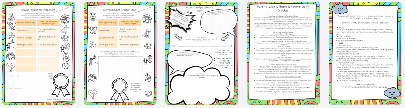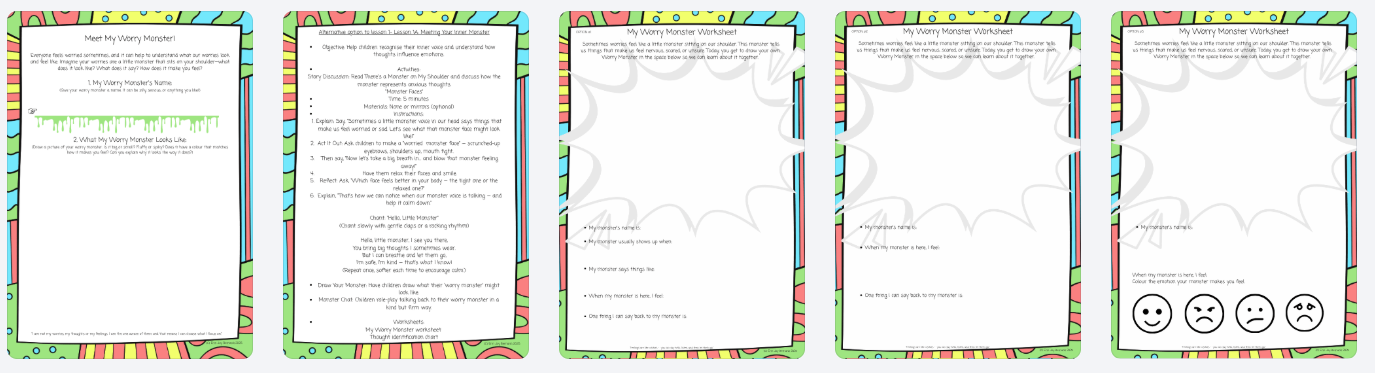 Interactive worksheets and creative exercises including journaling prompts, mindfulness activities, role-play tasks, and the β€œMonster Busting Toolkit” to support emotional regulation through hands-on learning.